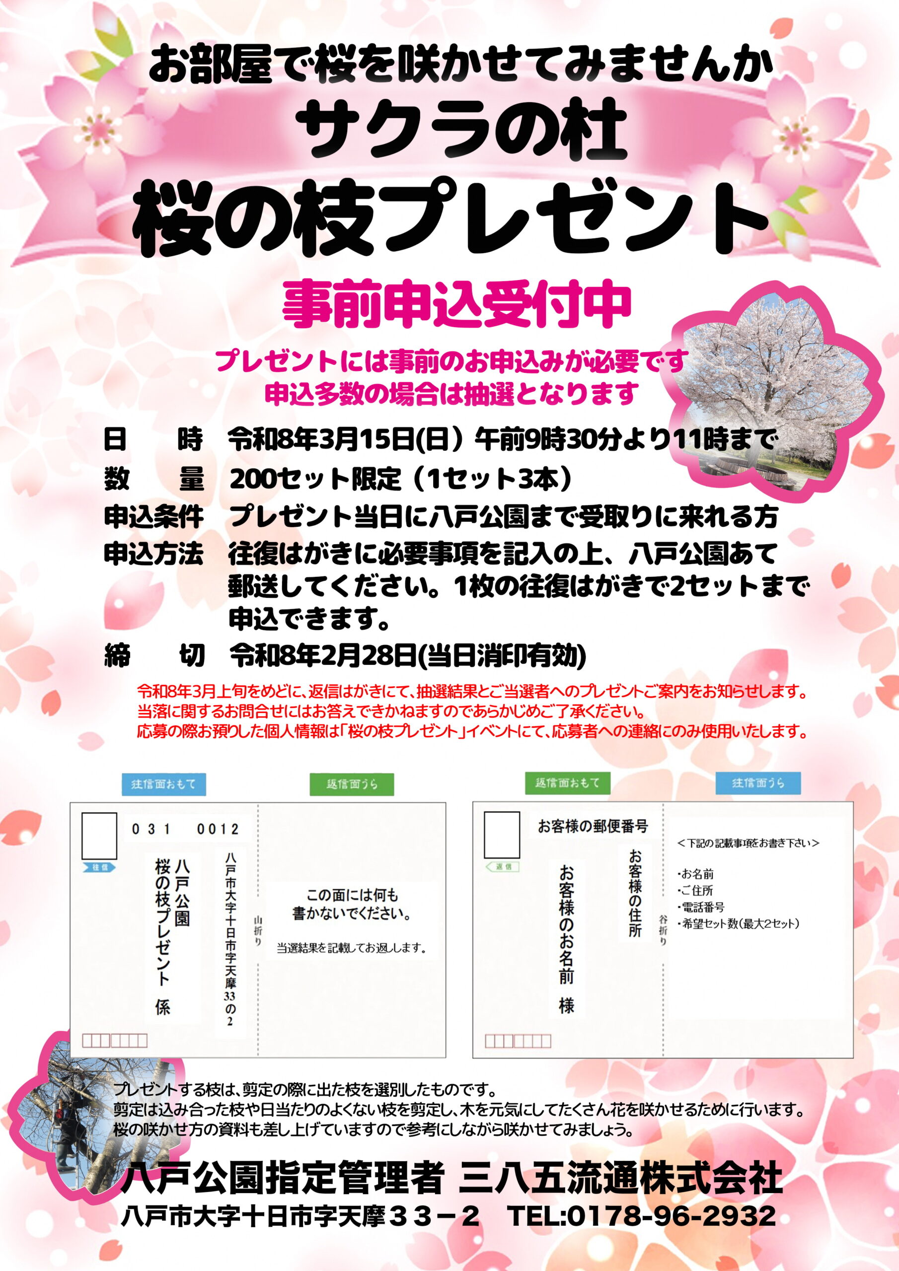 2/28(土)(消印有効)までに往復はがきで「八戸公園桜の枝プレゼント係」へ