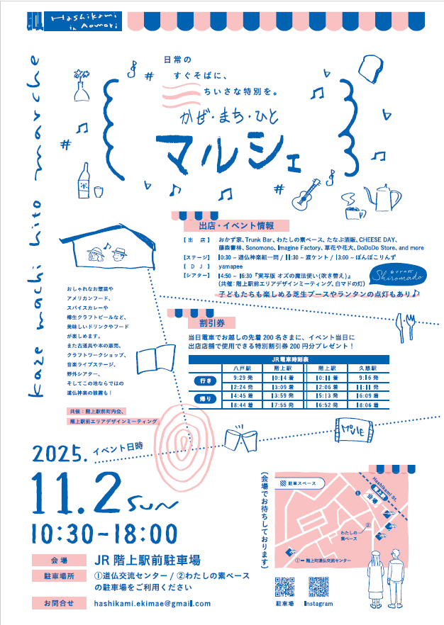 かぜ・まち・ひとマルシェ カレンダー 日時: 2025年11月2日 @ 10:30 – 18:002025-11-02T10:30:00+09:002025-11-02T18:00:00+09:00場所: JR階上駅前駐車場お問い合わせ: 階上駅前町内会・階上駅前エリアデザインミーティング メール イベント【日 時】2025 年11 月2 日(日)10:30~18:00【場 所】階上駅前広場(青森県階上町)【内 容】地元飲食店・クラフト出店、音楽ステージ、道仏神楽披露、ランタン点灯 など