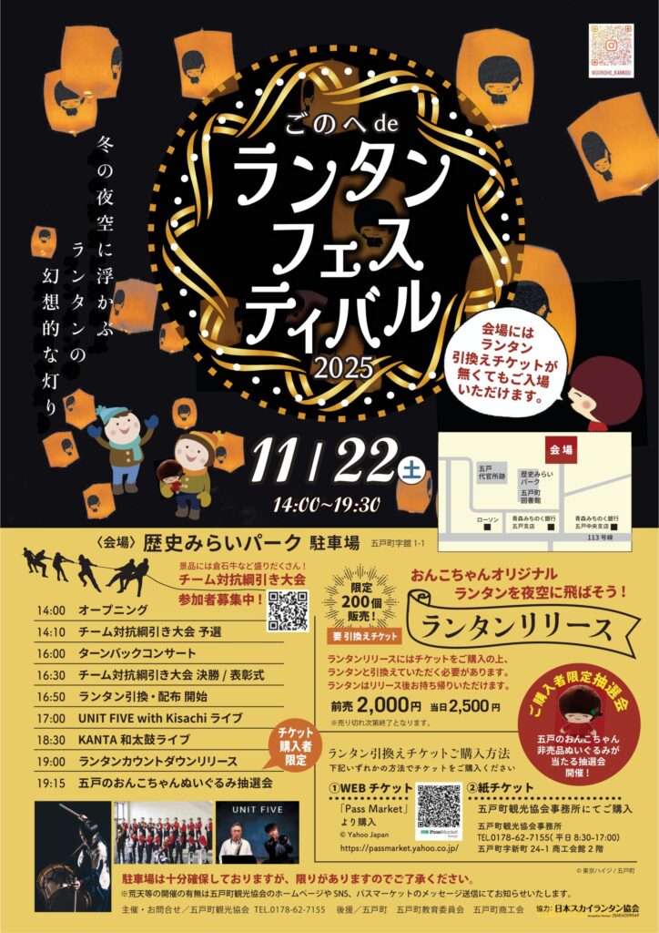 ごのへ de ランタンフェスティバル 2025 カレンダー 日時: 2025年11月22日 @ 14:00 – 19:302025-11-22T14:00:00+09:002025-11-22T19:30:00+09:00場所: 歴史みらいパーク駐車場 青森県三戸郡五戸町舘5−14お問い合わせ: 五戸町観光協会 0178-62-7155 イベントごのへdeランタンフェスティバル2025|冬の夜空に浮かぶ幻想的な灯り!和太鼓やライブも楽しめる一日詳しくはこちら