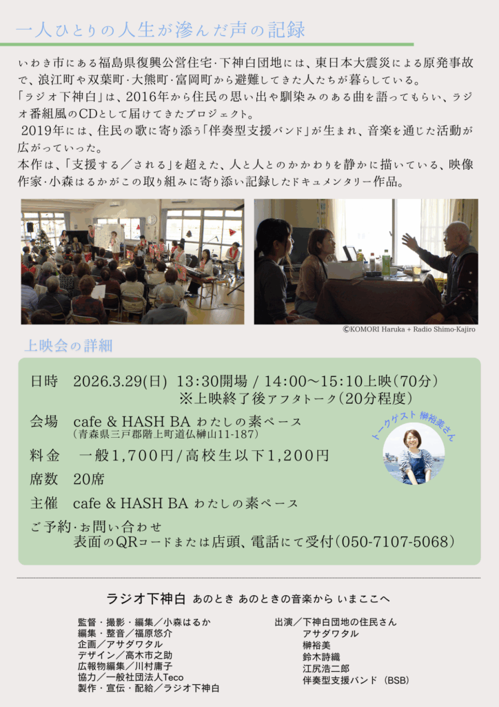 3/11の東日本大震災により、福島原発の被害で被災した方々への声や音楽に関する支援活動についてのドキュメンタリー作品を上映します。