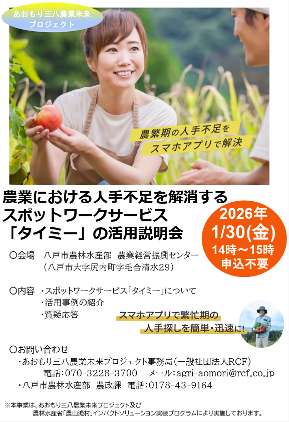 農業における人手不足を解消するため、スポットワークサービス「タイミー」の活用説明会を開催します。
