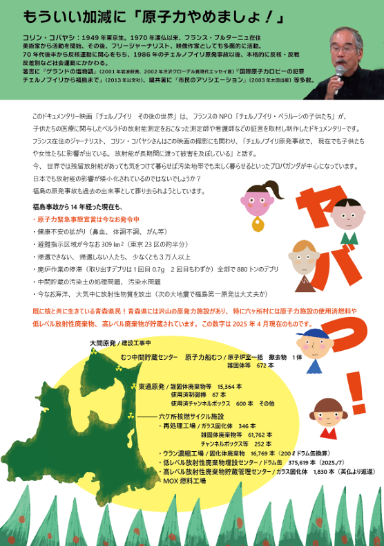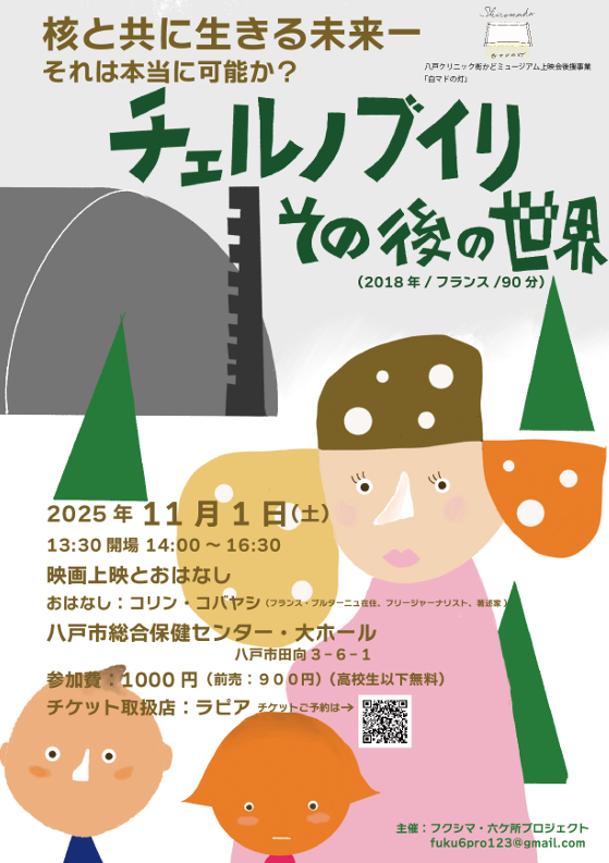 チェルノブイリその後の世界 カレンダー 日時: 2025年11月1日 @ 14:00 – 16:302025-11-01T14:00:00+09:002025-11-01T16:30:00+09:00場所: 八戸市総合保健センター 大ホール参加費: 1000円(前売り900円)高校生以下無料お問い合わせ: フクシマ・六ケ所プロジェクト 080-5577-8398 三笠 メール イベント【内容】映画上映とおはなし映画「チェルノブイリその後の世界」 (2028/フランス/80分)おはなし:コリン・コバヤシ (フランス在住・ブルターニュ在住、フリージャーナリスト、著述家)