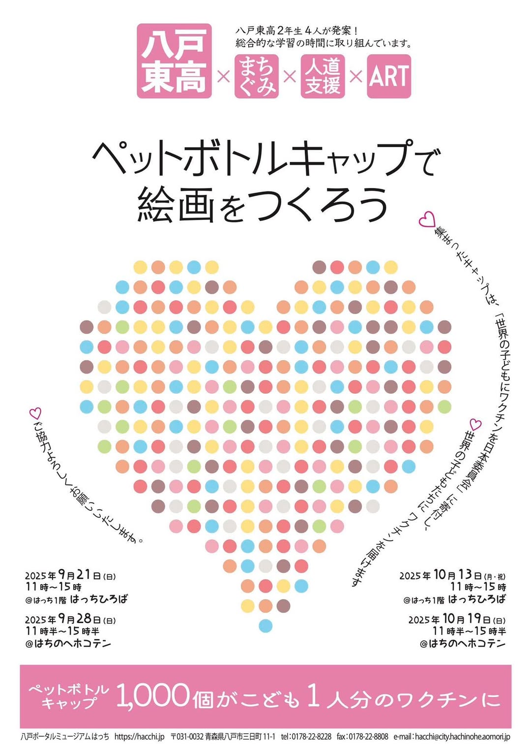 ペットボトルキャップで絵画をつくろう カレンダー 日時: 2025年10月13日 @ 11:00 – 15:30 Repeats 2025-10-13T11:00:00+09:002025-10-13T15:30:00+09:00場所: はちのへホコテン内・はっちひろば参加費: 無料お問い合わせ: 八戸ポータルミュージアム はっち 0178-22-8228 メール イベントのサイト イベント
