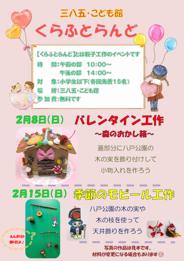 三八五・こども館 くらふとらんど 季節のモビール工作 Calendar いつ: 2026年2月15日 @ 10:00 – 16:002026-02-15T10:00:00+09:002026-02-15T16:00:00+09:00どこで: 三八五・こども館料金: 無料連絡先: 三八五・こども館 0178-96-3480 イベント季節のモビール工作【日時】2/15(日)午前の部10:00~12:00(受付開始9:30) 午後の部14:00~16:00(受付開始13:30)【対象】小学生以下(各回15名)【内容】八戸公園の木の実や木の枝を使って天井飾りを作ろう詳しくはこちら※当日は材料が変更になる場合があります。