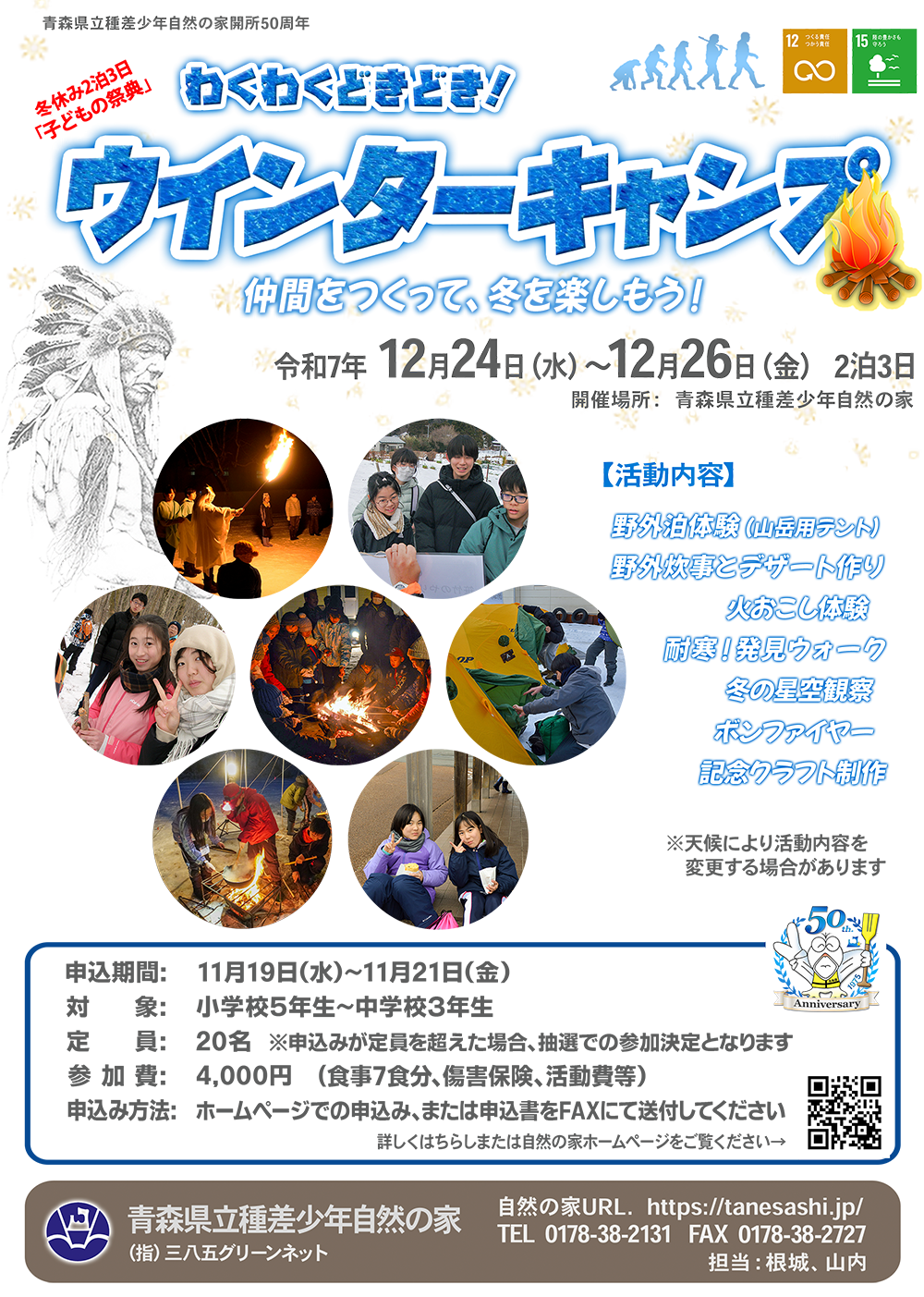 令和7年度 わくわくどきどきウインターキャンプ カレンダー 日時: 2025年12月24日 – 2025年12月26日 終日2025-12-24T00:00:00+09:002025-12-27T00:00:00+09:00場所: 種差少年自然の家参加費: 4000円お問い合わせ: 種差少年自然の家 0178-38-2131 FAX:0178-38-2727 イベント小・中学生が仲間とのふれあいを深めながら野外での生活を体験する機会を提供し、心豊かでたくましい子どもを育てます。 今回のキャンプでは、冬の野外泊や野外炊事、発見ウォークなどの体験活動を通して、仲間と協力し支え合う心を育てます。詳細や申し込みはこちら