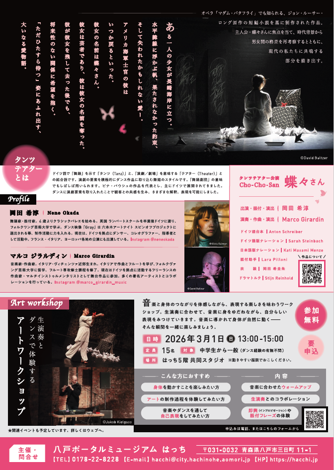 12 月に引き続き第二弾として、岡田希淳・マルコ ジラルディンによるタンツテアター(ダンスシアター)公演「Cho-Cho San 蝶々さん」を上演いたします。