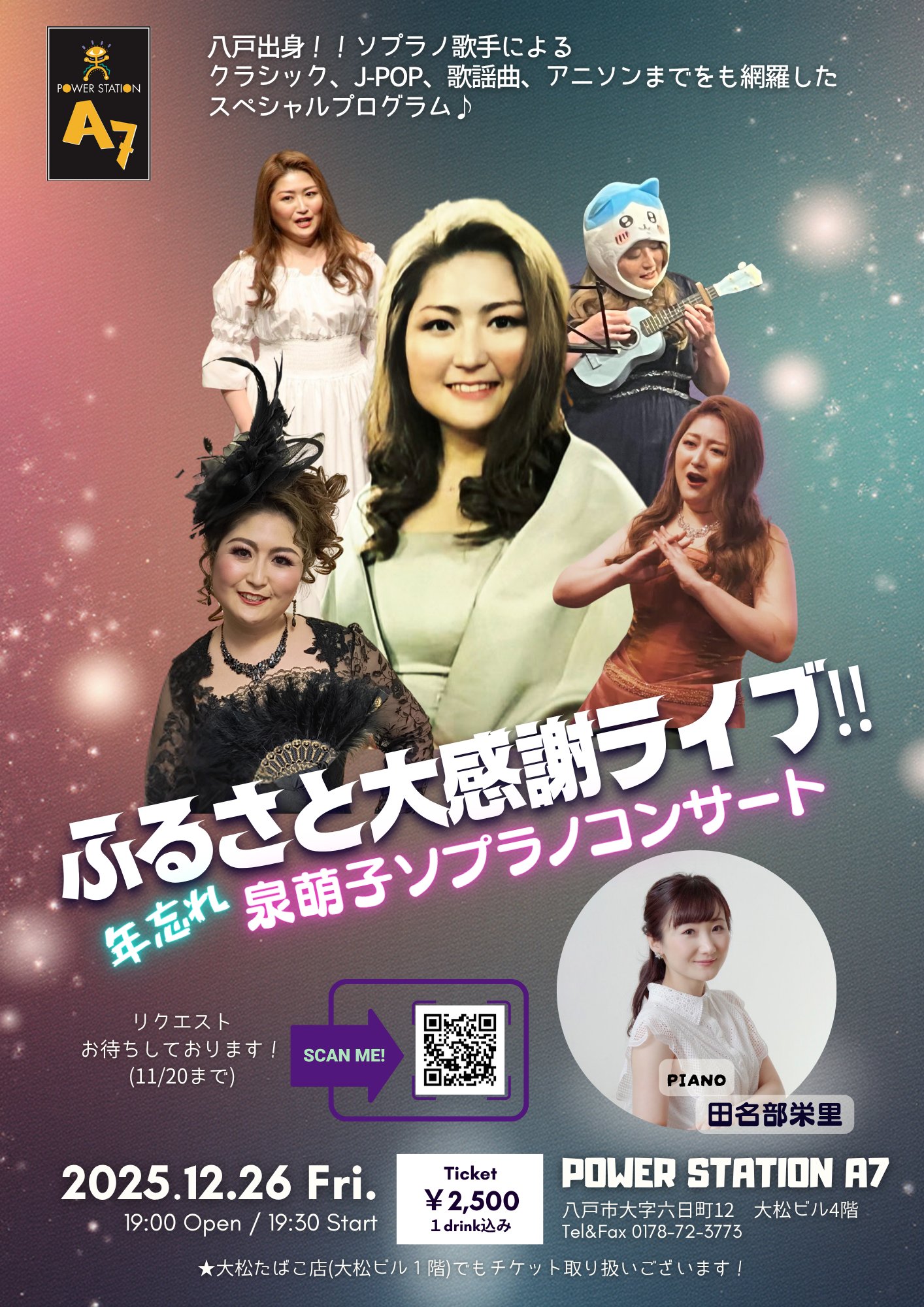 年忘れ 泉萌子ソプラノコンサート ふるさと大感謝ライブ カレンダー 日時: 2025年12月26日 @ 19:30 – 21:002025-12-26T19:30:00+09:002025-12-26T21:00:00+09:00場所: POWER STATION A7 八戸市大字六日町12 大松ビル4F参加費: 2500円(1ドリンク込み)お問い合わせ: POWER STATION A7 0178-72-3773 イベント八戸出身ソプラノ歌手による クラシック、J-POP、歌謡曲、アニソンまでを網羅したスペシャルプログラム♪【出演】 泉萌子(ソプラノ) 田名部栄里(ピアノ)