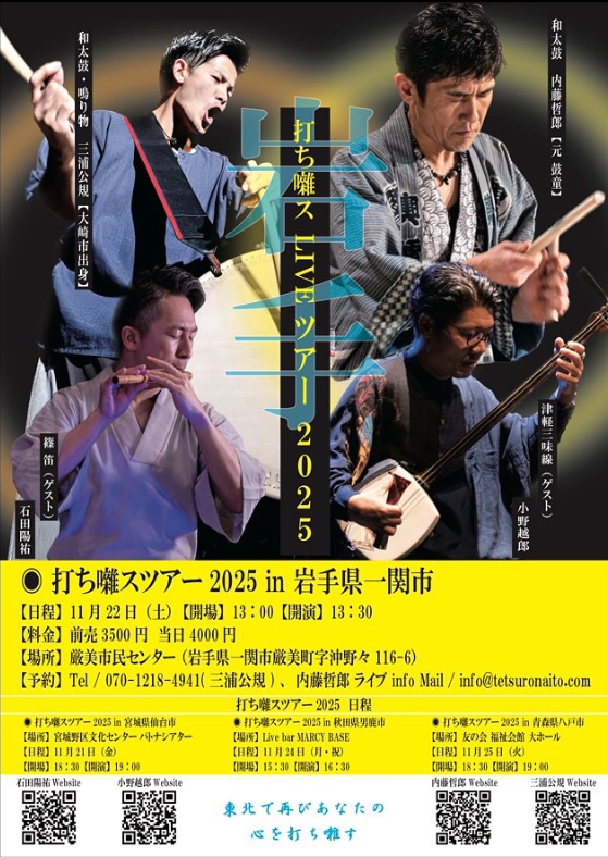 打ち囃ス LIVEツアー2025 カレンダー 日時: 2025年11月25日 @ 18:30 – 21:002025-11-25T18:30:00+09:002025-11-25T21:00:00+09:00場所: 友の会 福祉会館 大ホール参加費: 前売り3500 当日4000お問い合わせ: 内藤哲郎 070-1218-4941 メール イベント