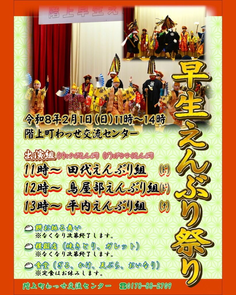 早生えんぶり祭り Calendar いつ: 2026年2月1日 @ 11:00 – 14:002026-02-01T11:00:00+09:002026-02-01T14:00:00+09:00どこで: 階上町わっせ交流センター連絡先: 階上町わっせ交流センター 0178-88-2709 イベント階上町内の3組のえんぶり組が一堂に会する、毎年恒例の「早生えんぶり祭り」が今年も開催されます! 餅のおふるまいや模擬店もあります ※餅・模擬店はなくなり次第終了です。