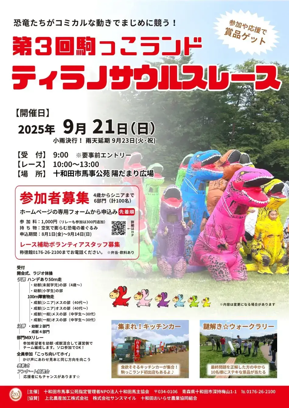 第3回 駒っこランド ティラノサウルスレース カレンダー 日時: 2025年9月21日 @ 09:00 – 13:002025-09-21T09:00:00+09:002025-09-21T13:00:00+09:00場所: 十和田市馬事公苑 駒っこランド 青森県十和田市深持梅山1−1参加費: 参加料1000円お問い合わせ: 十和田市馬事公苑 (駒っこランド) 0176-26-2100 イベントティラノサウルスレースは、各年代別レースの他に全員参加の「こっち向いてホイ」や、初試みとなる年代混合リレーを予定しております。また、キッチンカーの出店や謎解きウォークラリーもあります申し込みや詳細は こちら