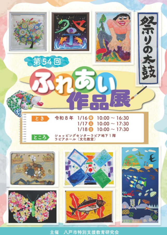 第54回 ふれあい作品展 カレンダー 日時: 2026年1月16日 @ 10:00 – 17:30 Repeats 2026-01-16T10:00:00+09:002026-01-16T17:30:00+09:00場所: ショッピングセンターラピア ラピアホール(文化教室)参加費: 無料お問い合わせ: 八戸市特別支援教育研究会 ふれあい作品展 担当:高橋 0178-28-3905 メール イベント【日時】 2026年1月16日(金)~18日(日)1/16日(金):10:00~16:30 1/17日(土):10:00~17:30 1/18日(日):10:00~17:30詳しくはこちら