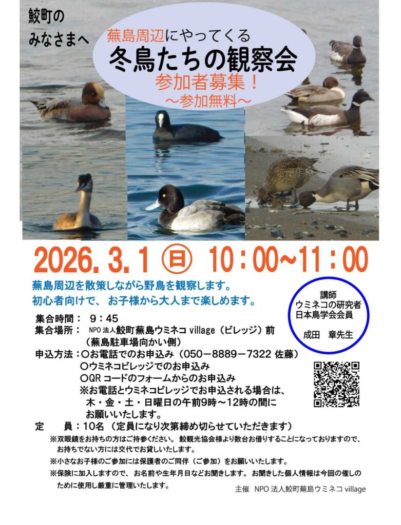蕪島周辺にやってくる 冬鳥たちの観察会 Calendar いつ: 2026年3月1日 @ 10:00 – 11:002026-03-01T10:00:00+09:002026-03-01T11:00:00+09:00どこで: 蕪島ウミネコビレッジ料金: 無料 イベント定員 10名【申込方法】・下記QRコードから ・またはお電話で ・直接ウミネコビレッジで皆さまのご参加をお待ちしております。詳しくはこちら