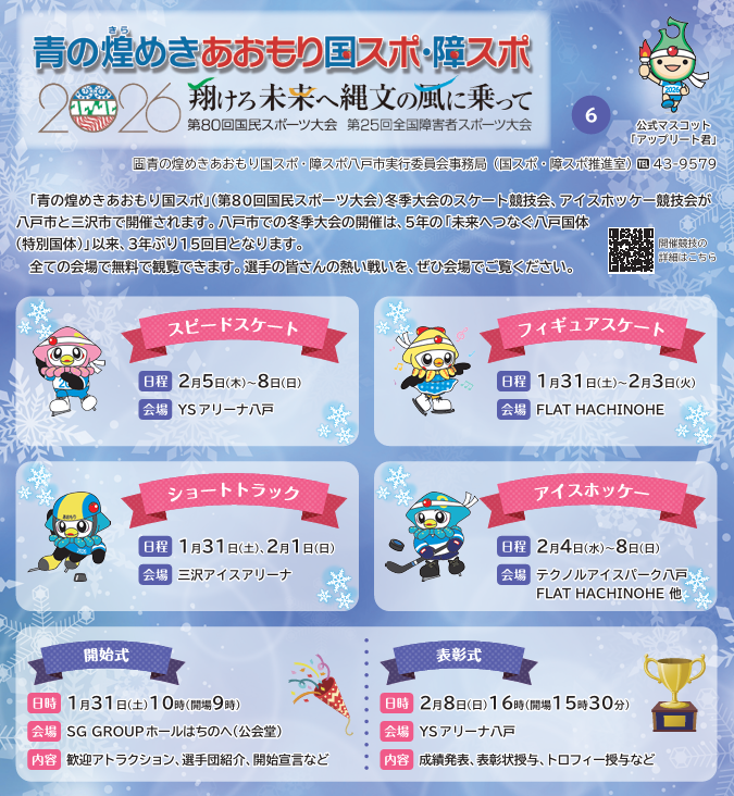 「青の煌めきあおもり国スポ」(第80回国民スポーツ大会)冬季大会のスケート競技会、アイスホッケー競技会が八戸市と三沢市で開催されます。